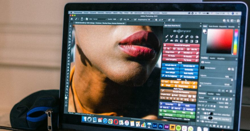 A laptop displaying graphic design patterns with a hand interacting, ideal for creative workspace themes.